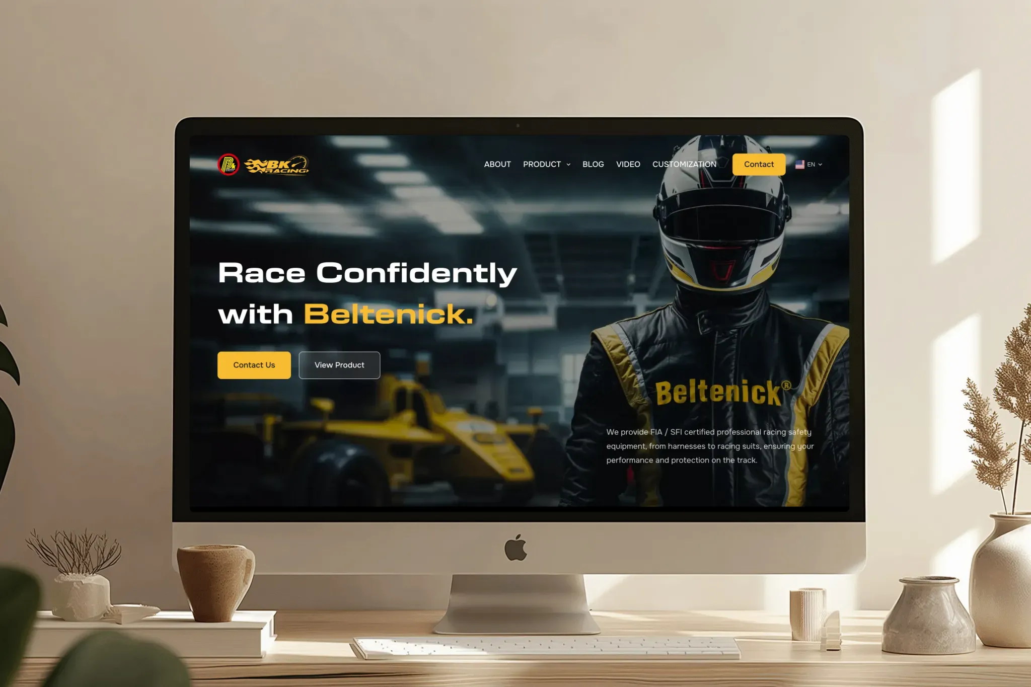 Beltenick 以賽車安全裝備為核心,透過清晰的導覽架構呈現完整產品線,涵蓋 Racing Harnesses(FIA/SFI、Cam Lock/Turnbuckle、Latch/Link、UTV)、賽車服飾(防火賽車服、手套、鞋、內著、頭套/襪)、賽車座椅(碳纖/玻纖/鋼製/可調/UTV/鋁座)與多元配件(窗網、頭盔支撐、拖車工具、方向盤、快拆、Simracing)。同時整合部落格、影片與客製化入口,便於快速選購與了解規格。