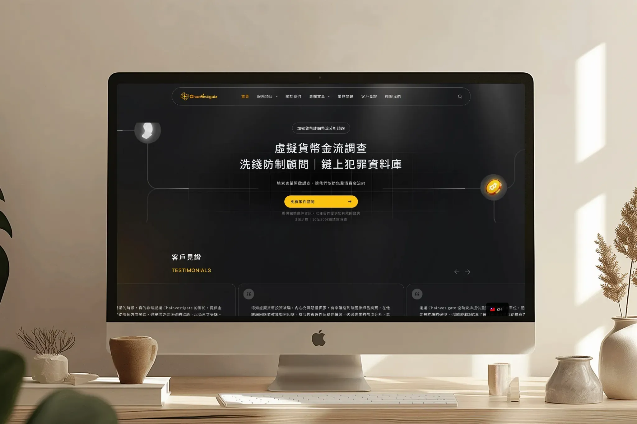 「虛擬貨幣詐騙調查及追償服務|Chainvestigate」聚焦加密貨幣詐騙案件的幣流分析、虛擬貨幣金流調查與洗錢防制/法令遵循等服務,並提供免費案件諮詢,引導使用者以表單在約 10–20 分鐘內提交完整資訊,協助釐清資金流向與後續處置方向。網站同時收錄客戶見證、專欄文章與案例內容,並預告鏈上犯罪資料庫即將上線,提升資訊透明度與信任感。